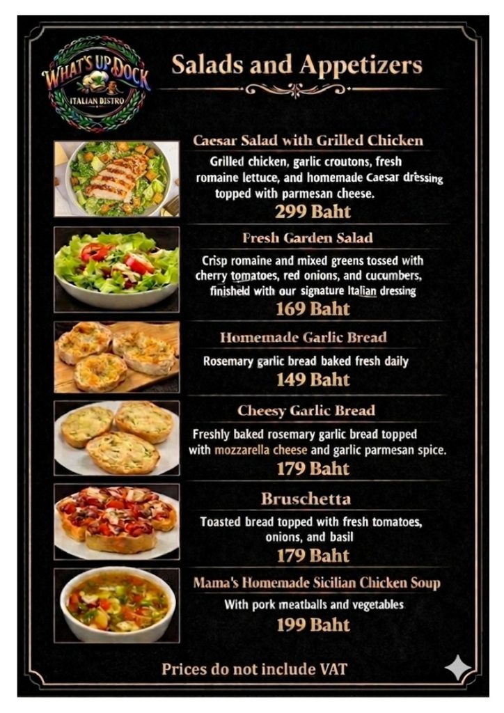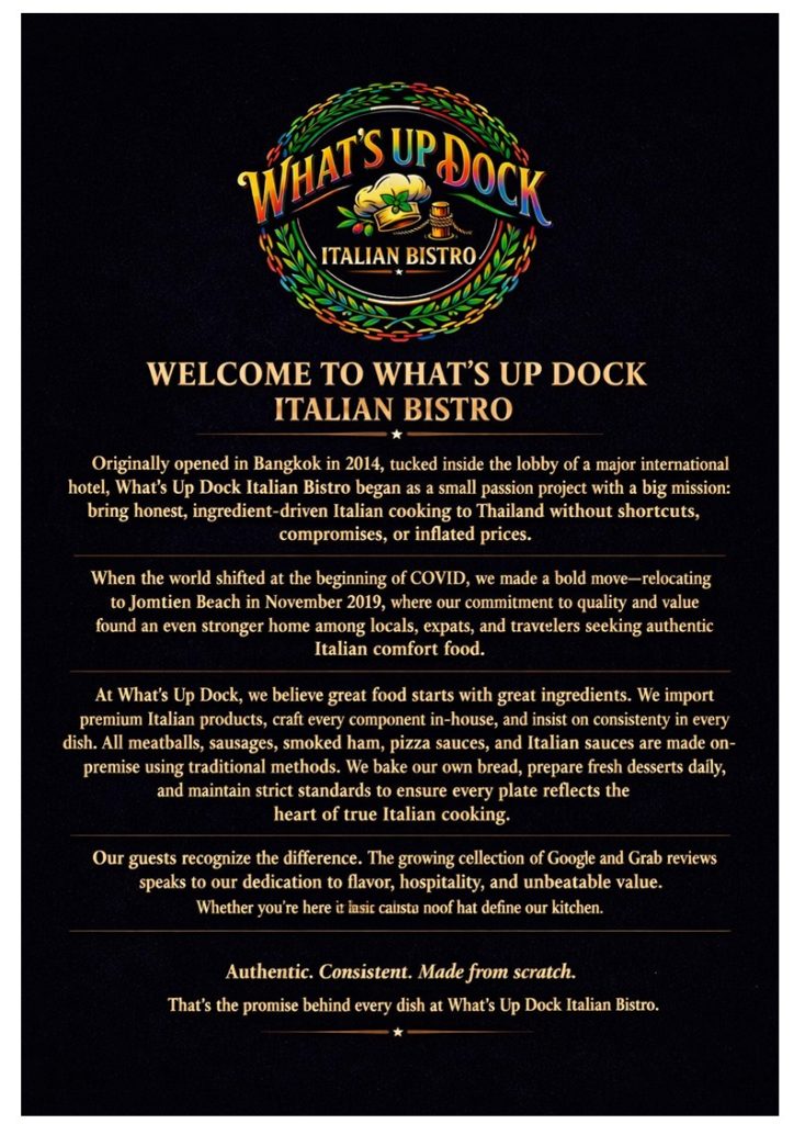 Welcome to WhatsUpDock Italian Bistro and Pizzaria. We are located at Jomtien Beach, on Soi Somprasong, a private soi with the Swensons Ice Cream at the beginning of the Soi.